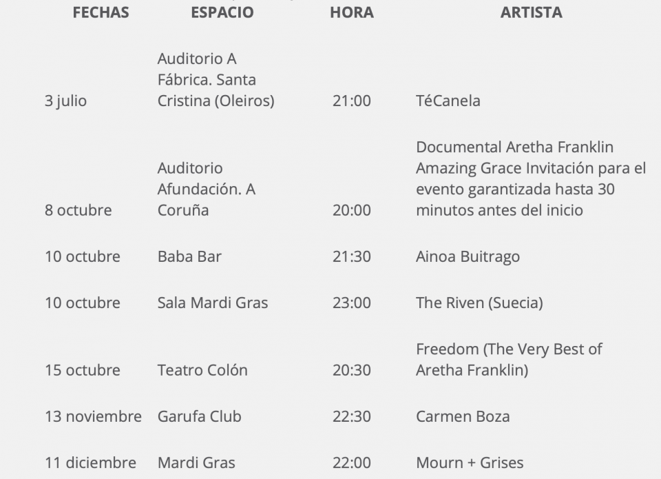 Festival metropolitano de música y arte por la igualdad que se celebra durante el mes de abril en A Coruña. Elas son artistas, cuyo programa estaba previsto para mediados de abril, se ha transformado en un ciclo metropolitano para adaptarse a la nueva normalidad y poder seguir adelante con todas las actuaciones y actividades que forman parte de su cartel. Los aforos de los conciertos se reducirán a 110 personas por el COVID.